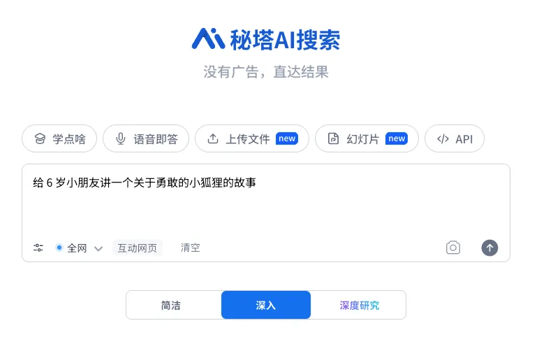 一句话就够,比如:“ 给 6 岁小朋友讲一个关于勇敢的小狐狸的故事 ”