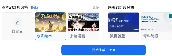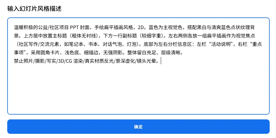 这里的自定义图片幻灯片就挺好玩的,可以用自定义去做出更多的效果,比如我就想要一个蓝色背景的,我就在输入的幻灯片风格描述里面这样写