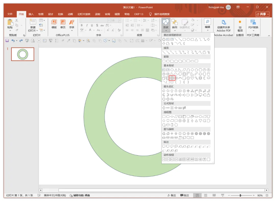 首先,绘制圆环状的底色图形。使用PPT创建空白文档后,插入基本图形中的空心圆,如下图,并调整“空心”的直径大小。