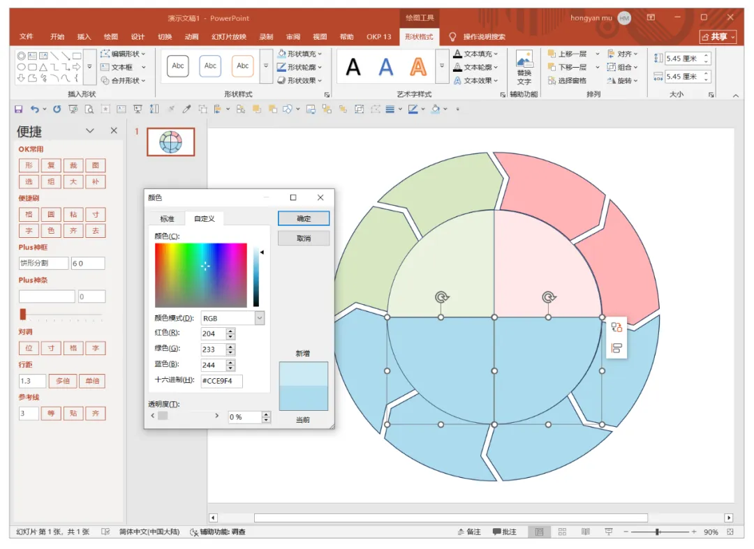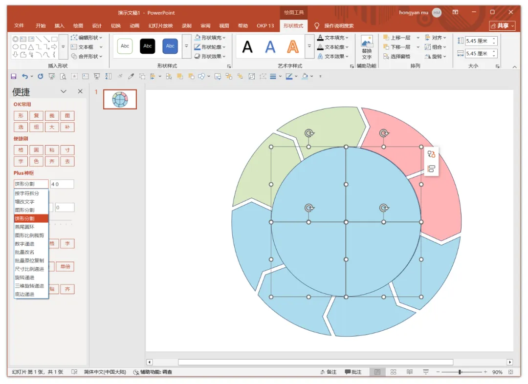 依次完成分割图形填充颜色的调整,继续绘制正圆图形,继续使用OK Plus13插件的“饼形分割”功能将正圆分割成4份,如下图。