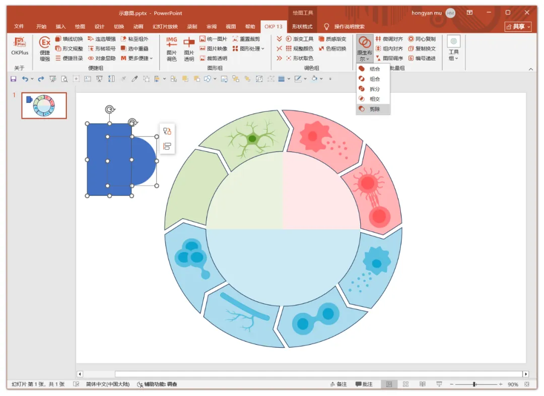 当然,如果你有耐心,也可以使用PPT的曲线、任意多边形、编辑顶点等功能进行图形绘制,结合OK Plus13插件的原生布尔功能进行拆分和减除图形,进而实现各种复杂组合图形的绘制,如下图。