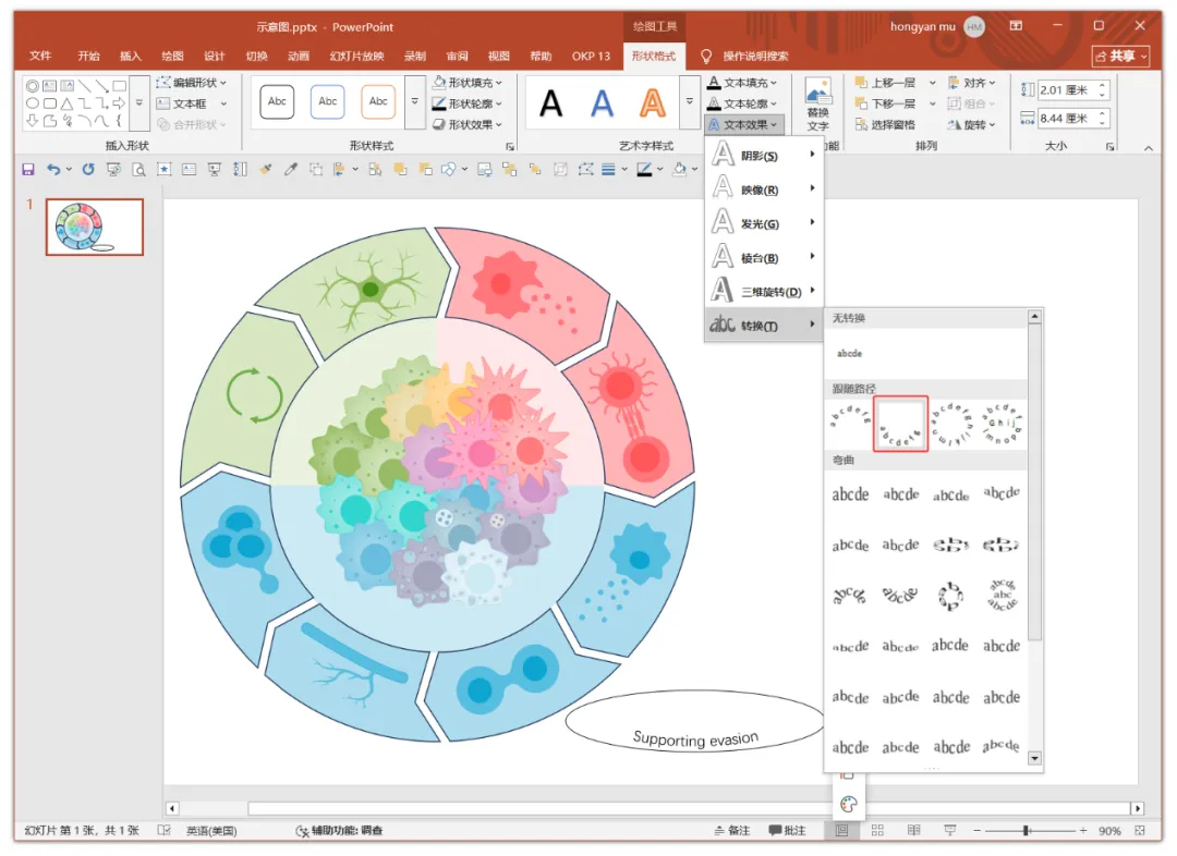 接下来是添加跟随环状路径的文本标签。先绘制一个椭圆,在其中添加文本,然后在文本效果中选择“跟随路径”效果,如下图,这里可选择向上和向下两种弧形样式。