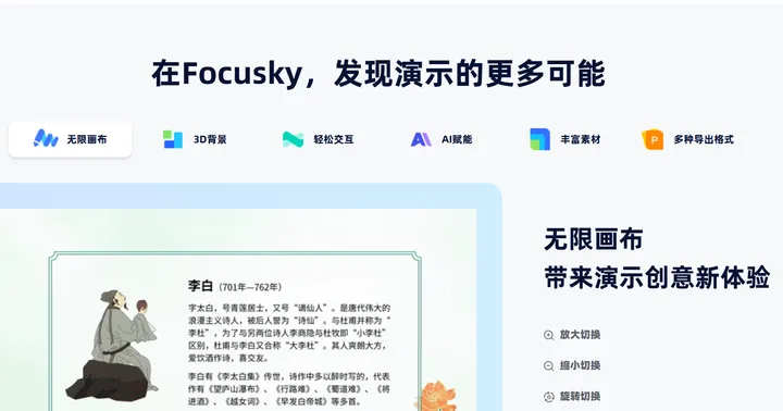 Focusky(万彩演示大师)主打动态3D演示效果,适合制作需要打破传统线性演示的ppt课件。我在制作理科实验流程、历史时间线、地理地貌讲解、天文知识科普等课件时,会用这款工具,它的3D镜头缩放、旋转特效,能让静态知识点变得立体生动,帮助学生理解复杂概念与空间关系。操作界面简洁直观,支持导入现有PPT,将普通课件转化为3D动态演示文稿,无需从零开始制作,降低学习与使用成本。