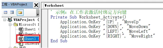 在Worksheet_Activate(工作表激活)事件中绑定方向键及其对应的宏操作,使用的是VBA内置的、专门用于自定义键盘快捷键的Application.OnKey方法