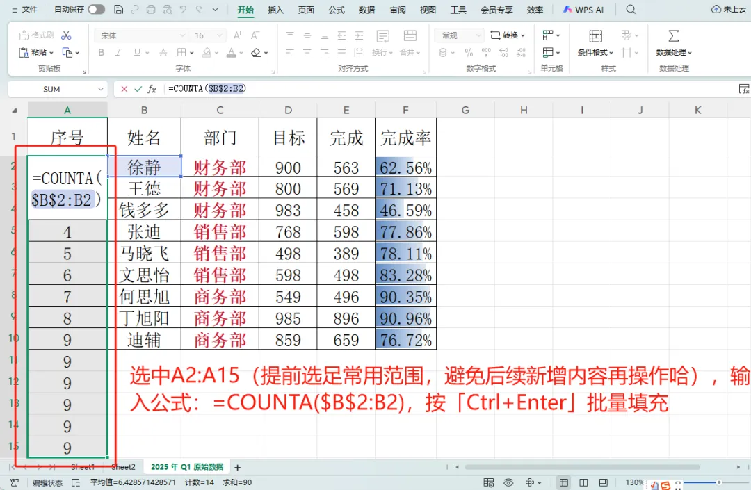 选中A2:A15(提前选足常用范围,避免后续新增内容再操作💡),输入公式:=COUNTA($B$2:B2),按「Ctrl+Enter」批量填充。