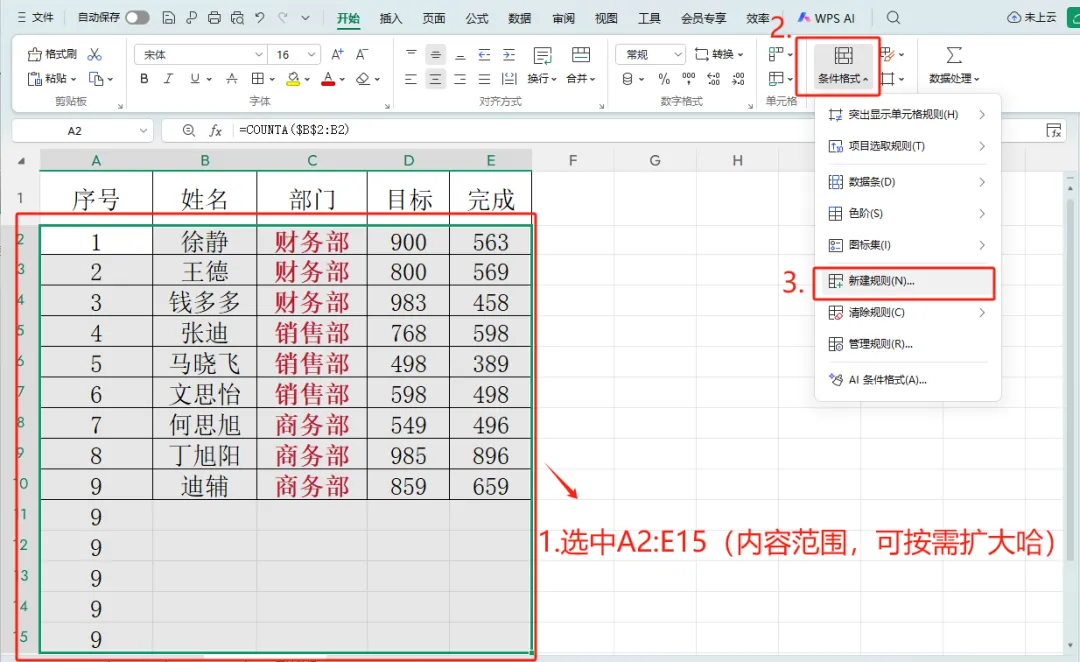 1️⃣选中A2:E15(内容范围,可按需扩大哈);
