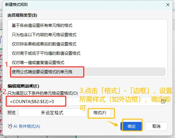 2️⃣输入公式:=COUNTA($B2:$E2)>0,点击「格式」-「边框」,设置所需样式(如外边框+内边框),确定即可。