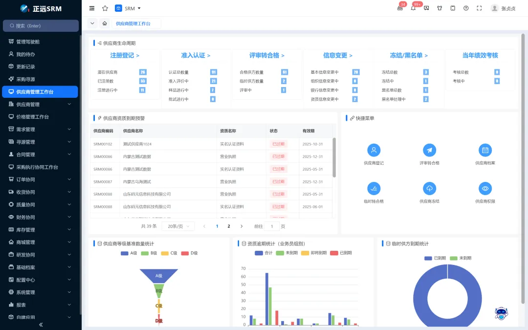 供应商管理:将供应商档案、资质集中在统一平台,统一管理,及时预警,保证供应商合规。
