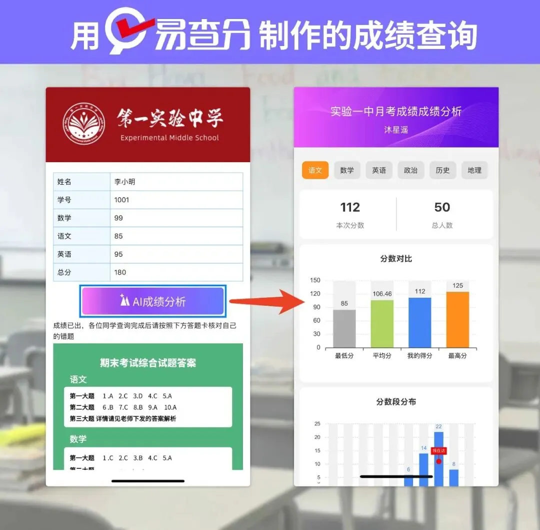 操作流程:登录易查分官网(www.yichafen.com)→点击“新建查询”→上传含姓名、学号、各科成绩的Excel表格→设置查询条件(如学号/手机尾号)→开启安全选项(如锁定查询、开门口令)→生成链接或二维码→转发至家长群。