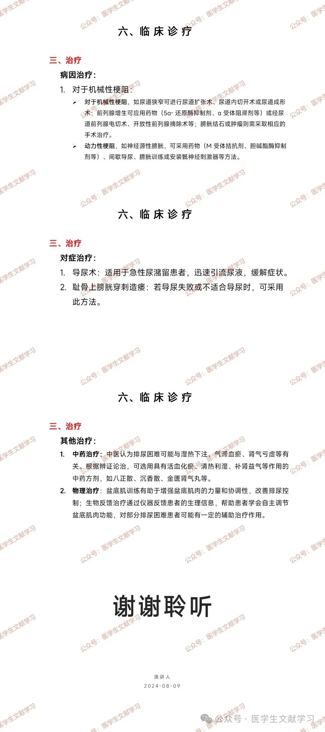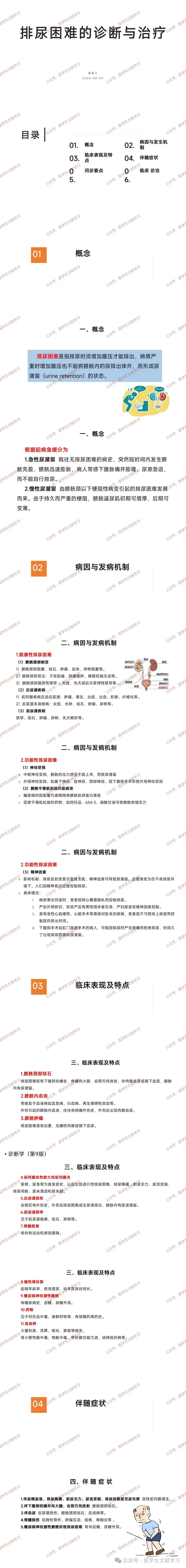对症治疗:导尿术(急性尿潴留)、耻骨上膀胱穿刺造瘘(导尿失败或不适合导尿时)。