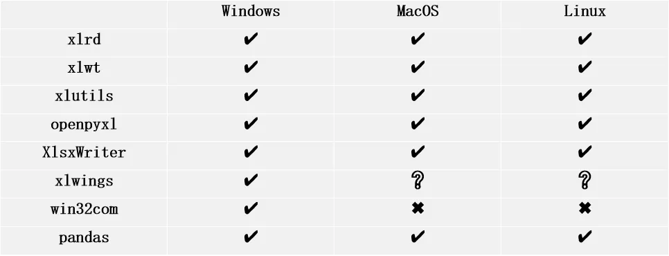 (✔表示适用,❓表示可能有兼容问题,✖表示不适用)