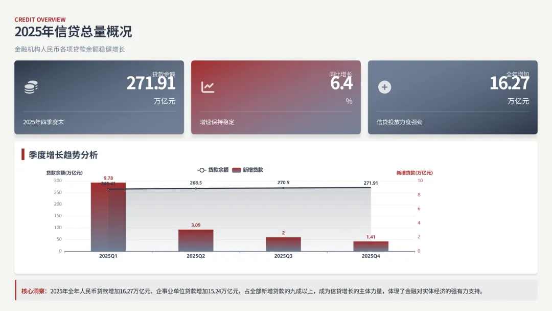 中国人民银行统计,2025年四季度末,金融机构人民币各项贷款余额271.91万亿元,同比增长6.4%,全年人民币贷款增加16.27万亿元。