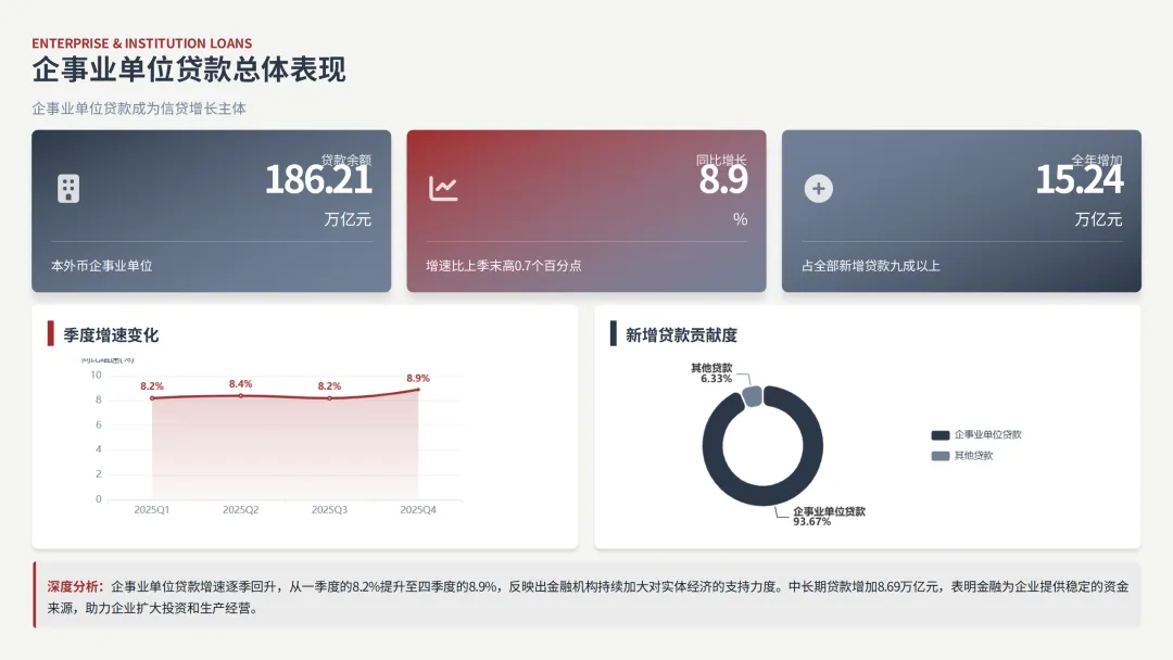 2025年四季度末,本外币企事业单位贷款余额186.21万亿元,同比增长8.9%,增速比上季度末高0.7个百分点,全年增加15.24万亿元。
