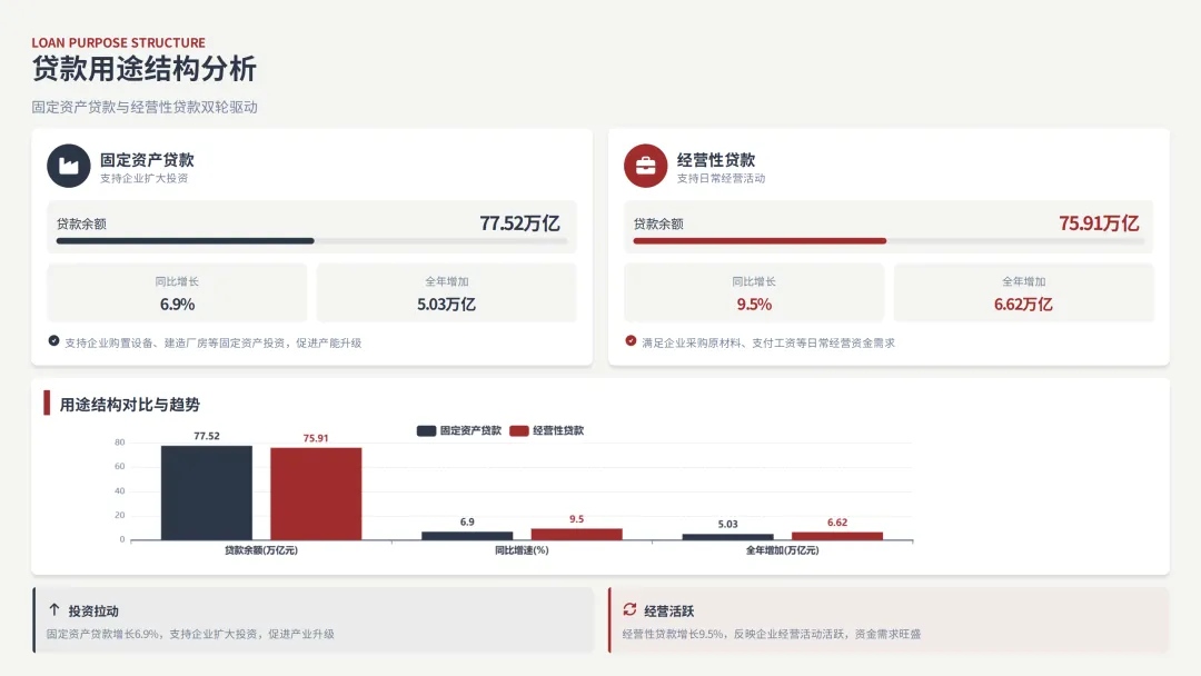 分用途看,固定资产贷款余额77.52万亿元,同比增长6.9%,全年增加5.03万亿元。经营性贷款余额75.91万亿元,同比增长9.5%,全年增加6.62万亿元。