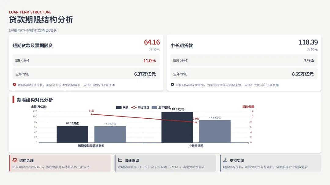 分期限看,短期贷款及票据融资余额64.16万亿元,同比增长11.0%,全年增加6.37万亿元。中长期贷款余额118.39万亿元,同比增长7.9%,全年增加8.69万亿元。
