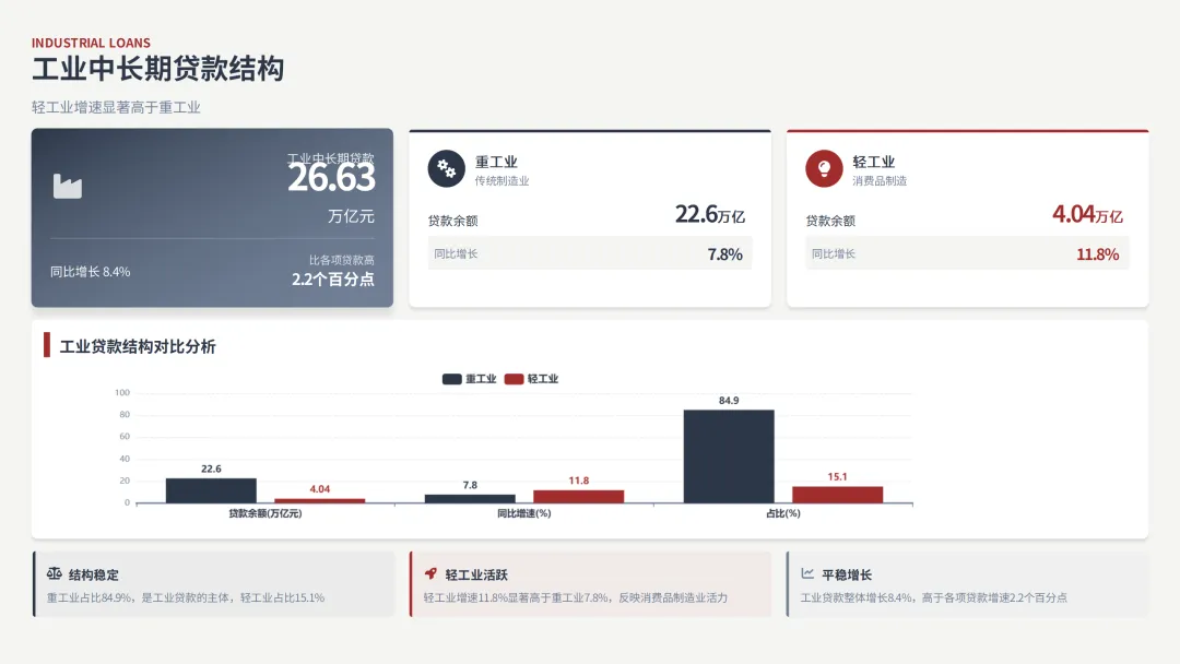 2025年四季度末,本外币工业中长期贷款余额26.63万亿元,同比增长8.4%,增速比各项贷款高2.2个百分点,全年增加2.11万亿元。其中,重工业中长期贷款余额22.6万亿元,同比增长7.8%;轻工业中长期贷款余额4.04万亿元,同比增长11.8%。