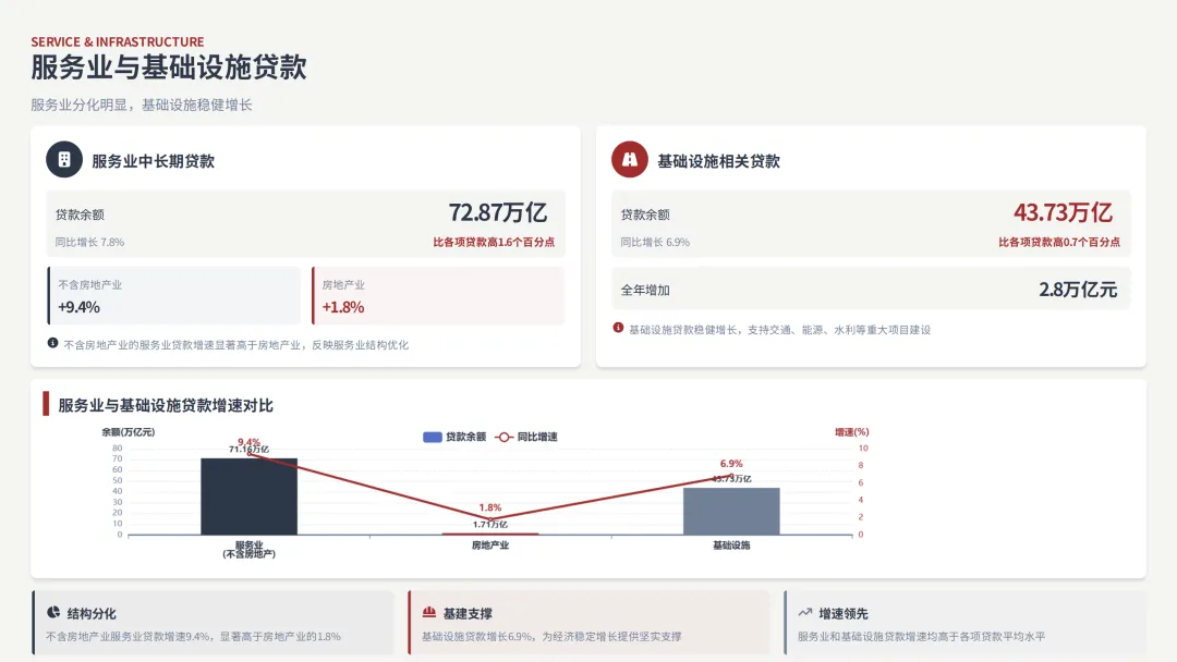 2025年四季度末,本外币基础设施相关行业中长期贷款余额43.73万亿元,同比增长6.9%,增速比各项贷款高0.7个百分点,全年增加2.8万亿元。