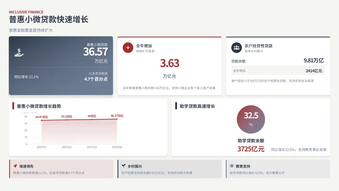 2025年四季度末,人民币普惠小微贷款1余额36.57万亿元,同比增长11.1%,增速比各项贷款高4.7个百分点,全年增加3.63万亿元。单户授信小于500万元的农户经营性贷款余额9.81万亿元,全年增加2414亿元。助学贷款余额3725亿元,同比增长32.5%。