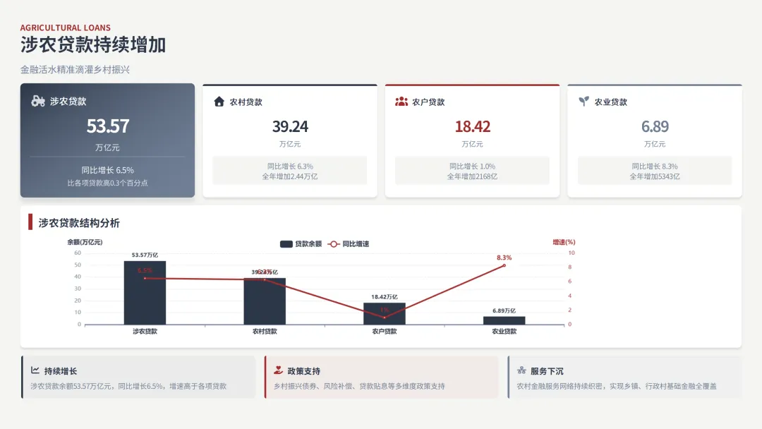 2025年四季度末,本外币涉农贷款3余额53.57万亿元,同比增长6.5%,增速比各项贷款高0.3个百分点,全年增加3.44万亿元。
