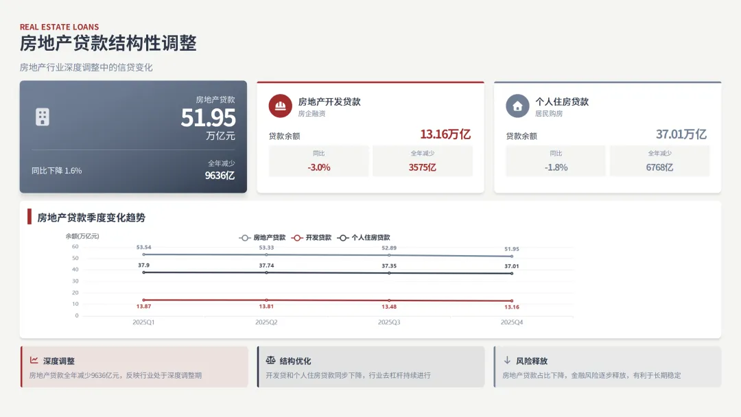 2025年四季度末,人民币房地产贷款余额51.95万亿元,同比下降1.6%,全年减少9636亿元。
