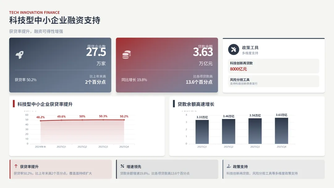 2025年四季度末,获得贷款支持的科技型中小企业27.5万家,获贷率5为50.2%,比上年末高2个百分点。本外币科技型中小企业贷款余额3.63万亿元,同比增长19.8%,增速比各项贷款高13.6个百分点。