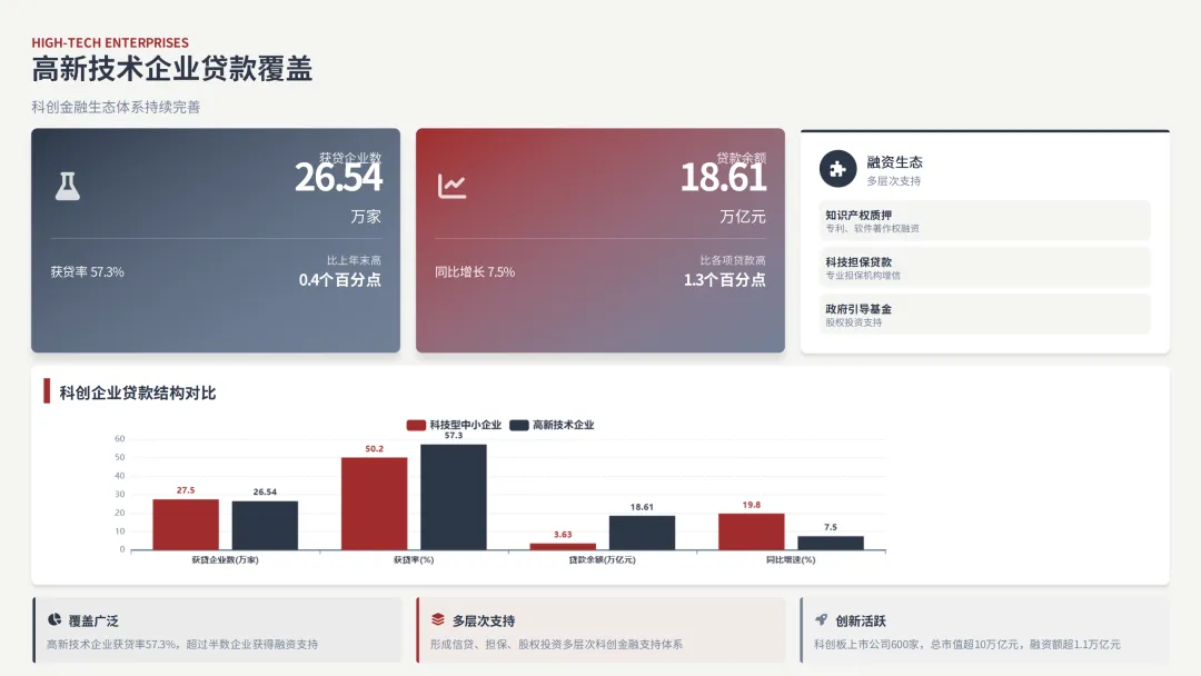 2025年四季度末,获得贷款支持的高新技术企业26.54万家,获贷率为57.3%,比上年末高0.4个百分点。本外币高新技术企业贷款余额18.61万亿元,同比增长7.5%,增速比各项贷款高1.3个百分点。