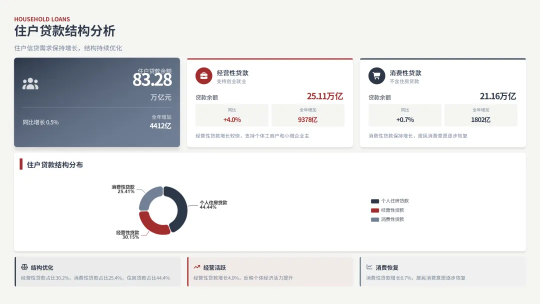 2025年四季度末,本外币住户贷款余额83.28万亿元,同比增长0.5%,全年增加4412亿元。其中,经营性贷款余额25.11万亿元,同比增长4.0%,全年增加9378亿元。不含个人住房贷款的消费性贷款余额21.16万亿元,同比增长0.7%,全年增加1802亿元。
