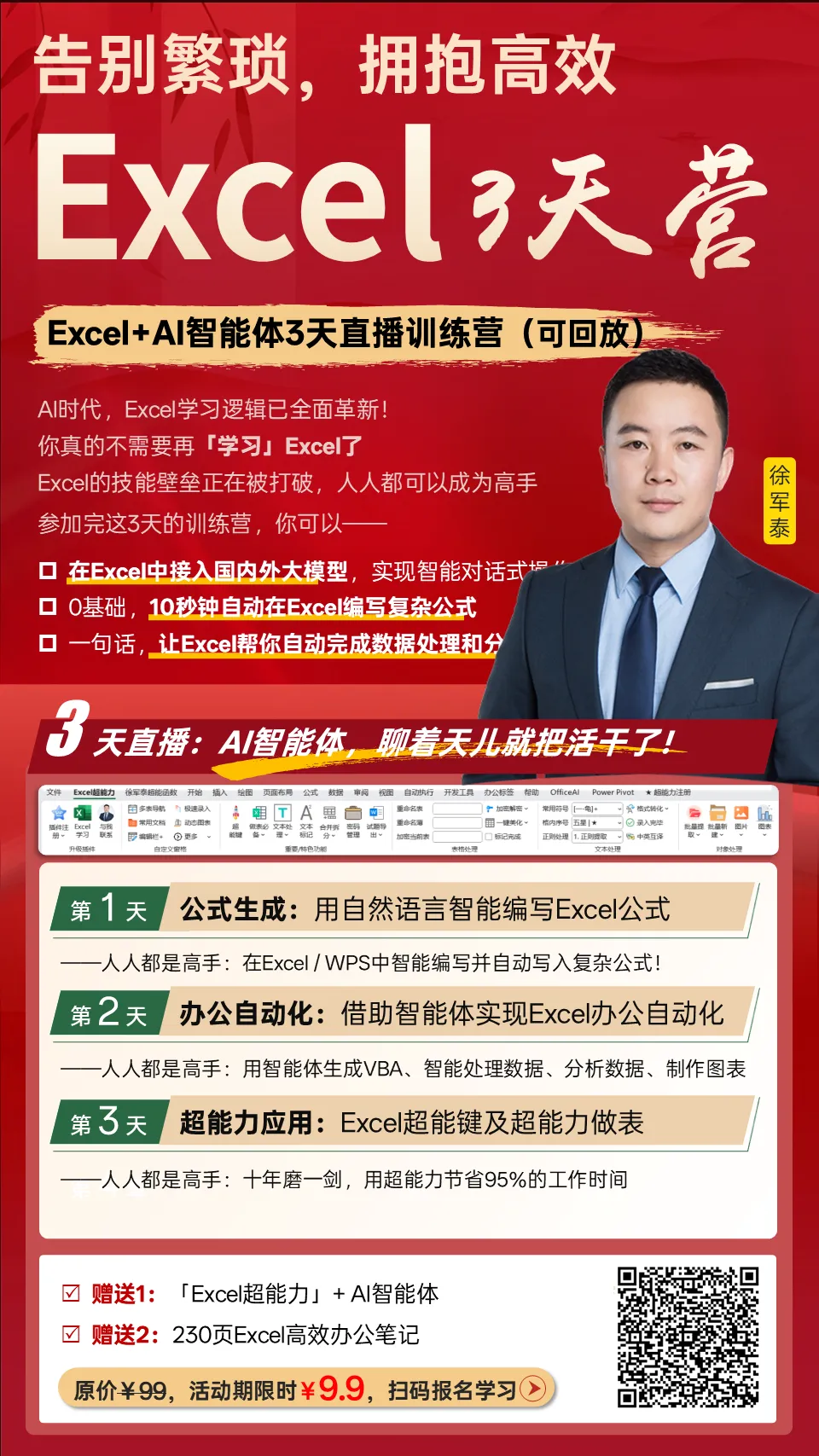 人人都是Excel高手的时代来了~大家好,本周末我将组织一期Excel·Ai智能体3天营,以视频直播的方式教你如何借助Ai开启Excel智能办公。3天直播,可回放,一定会颠覆你的认知。报名后在详情页加我,邀请你进群。欢迎朋友们分享、转发~