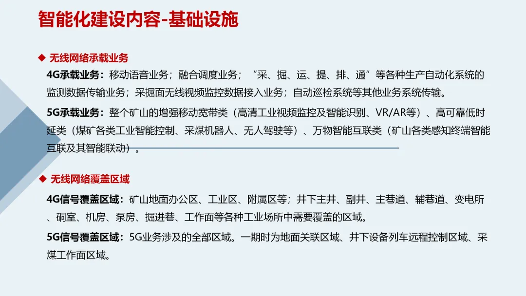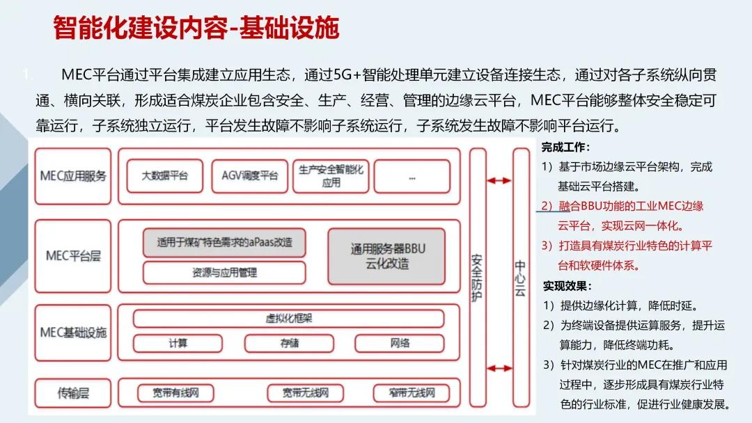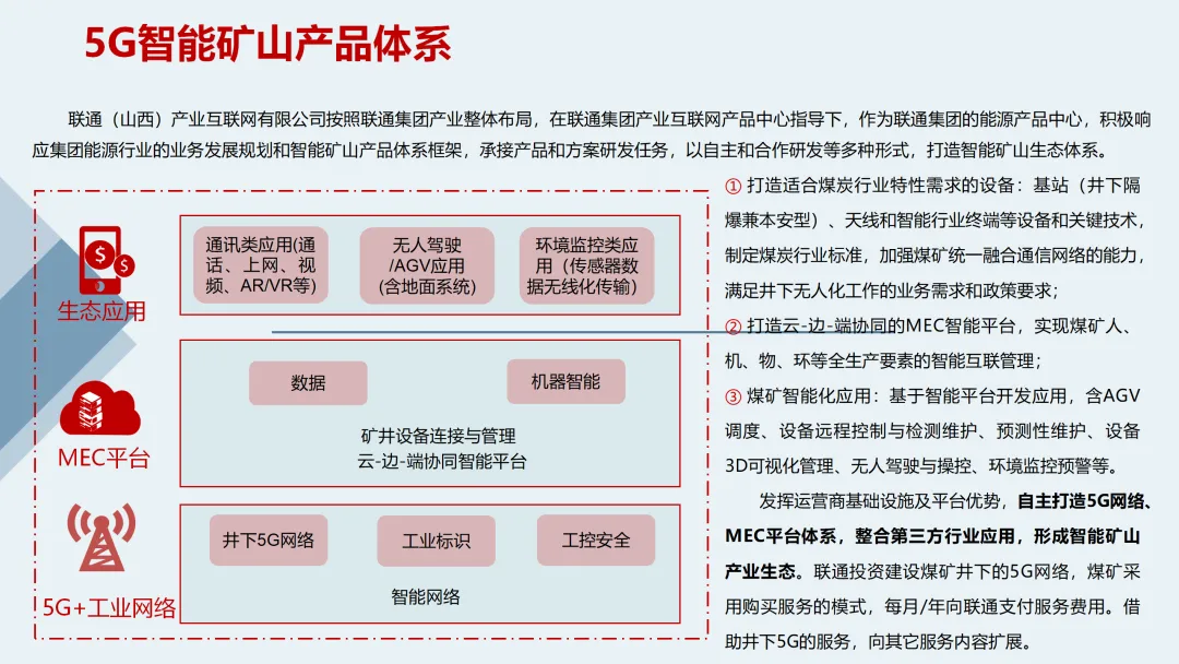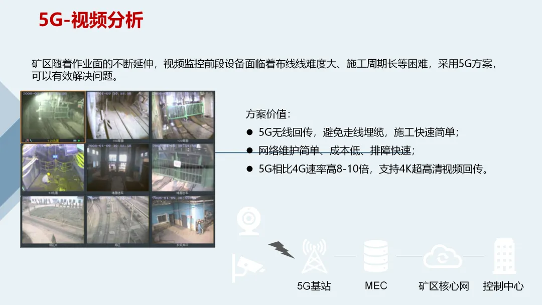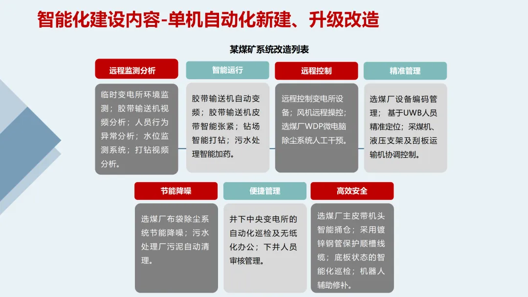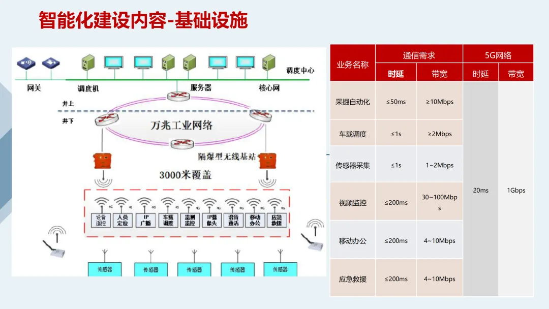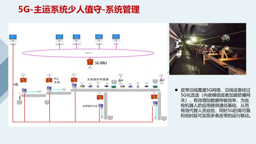 方案以统一信息化标准为基础,完善井下5G网络、MEC边缘云、工业环网等核心基础设施,实现井下关键区域5G信号全覆盖,满足采掘自动化、高清视频回传、设备远程控制等低时延、高带宽业务需求。通过对子系统的新建与升级改造,实现采掘、运输、通风、排水等场景的无人值守,搭载智能穿戴设备、AI视频分析、煤流智能控制等技术,替代人工完成高危环境作业与高频次巡检,大幅降低安全风险与人力成本。