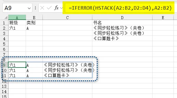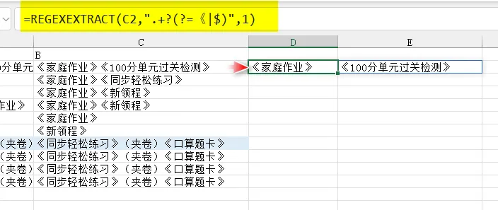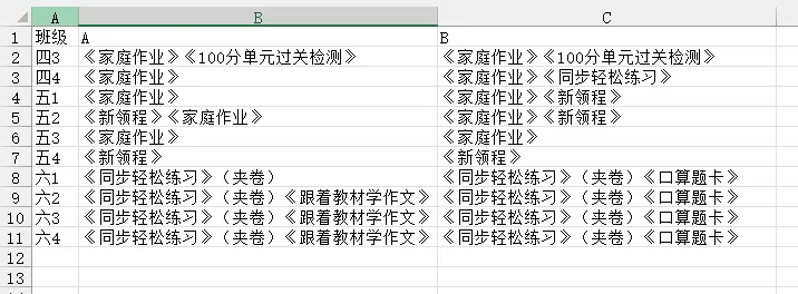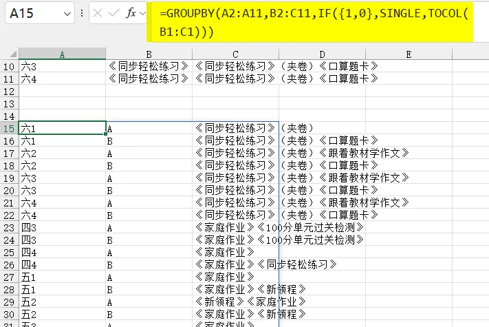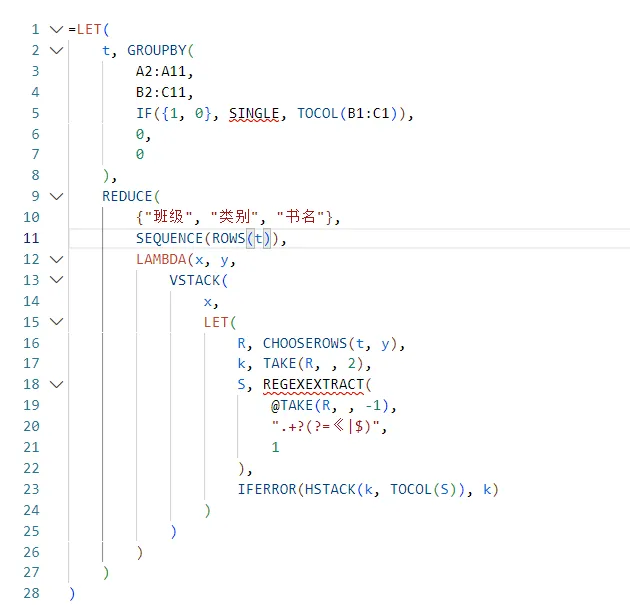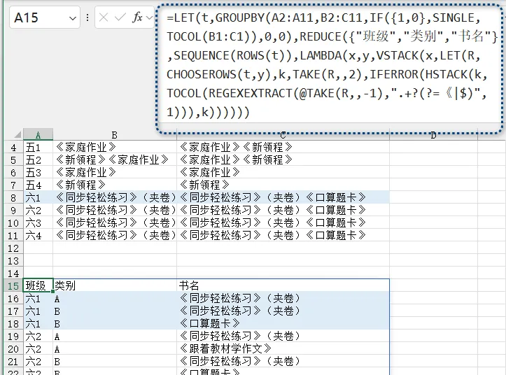 ▼完整公式=LET(t,GROUPBY(A2:A11,B2:C11,IF({1,0},SINGLE,TOCOL(B1:C1)),0,0),REDUCE({"班级","类别","书名"},SEQUENCE(ROWS(t)),LAMBDA(x,y,VSTACK(x,LET(R,CHOOSEROWS(t,y),k,TAKE(R,,2),S,REGEXEXTRACT(@TAKE(R,,-1),".+?(?=《|$)",1),IFERROR(HSTACK(k,TOCOL(S)),k))))))