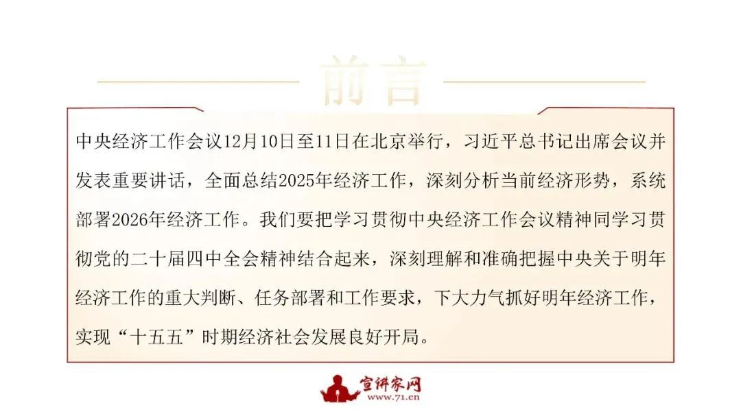 中央经济工作会议12月10日至11日在北京举行,习近平总书记出席会议并发表重要讲话,全面总结2025年经济工作,深刻分析当前经济形势,系统部署2026年经济工作。我们要把学习贯彻中央经济工作会议精神同学习贯彻党的二十届四中全会精神结合起来,深刻理解和准确把握中央关于明年经济工作的重大判断、任务部署和工作要求,下大力气抓好明年经济工作,实现“十五五” 时期经济社会发展良好开局。