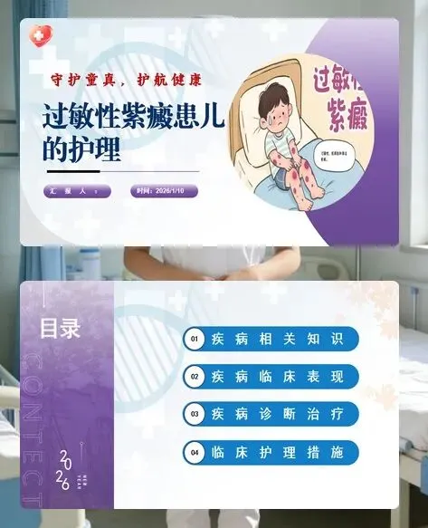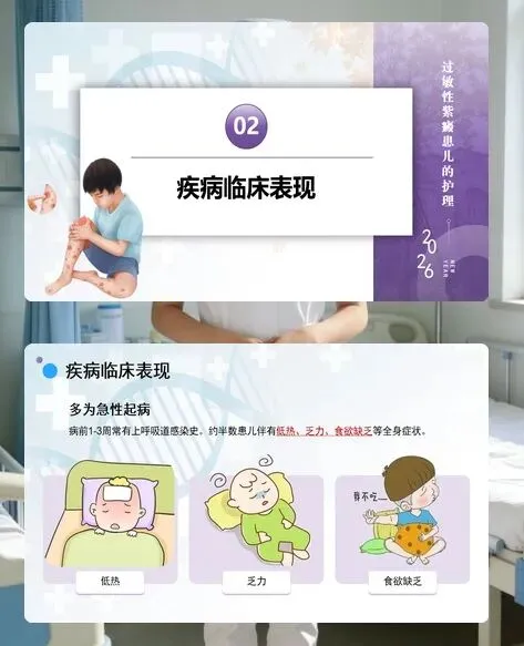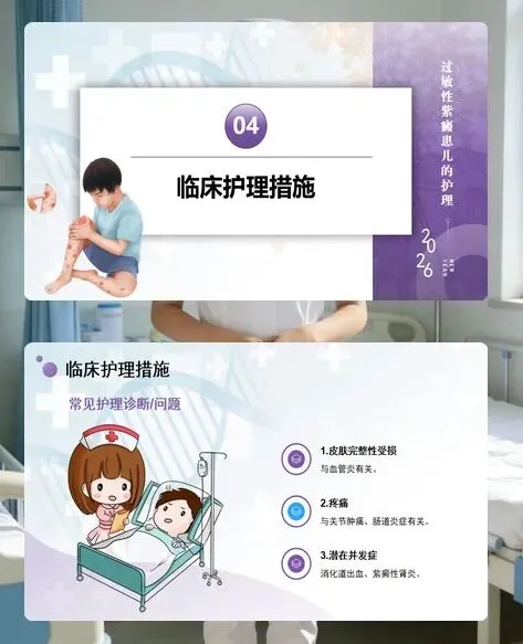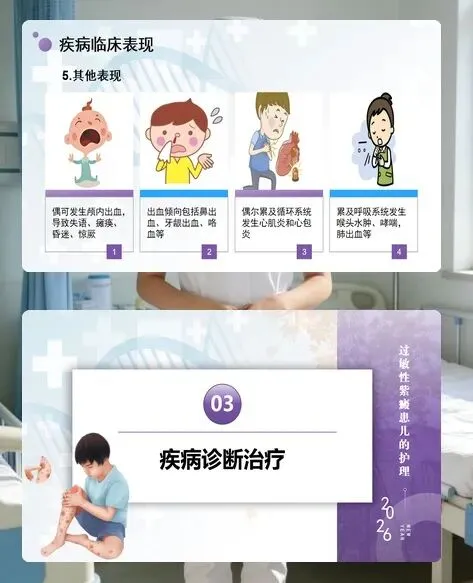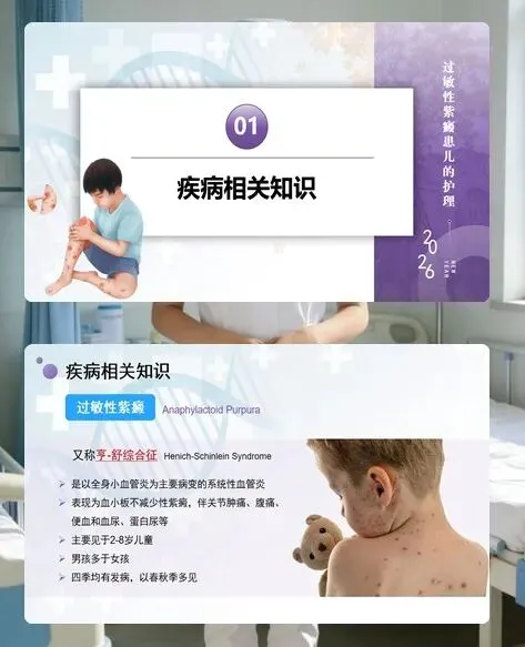 各位护理同仁,过敏性紫癜是儿童常见的系统性血管炎,主要累及 2-8 岁儿童,男孩多于女孩,春秋季高发。这类疾病起病急、症状复杂,不仅有特征性皮肤紫癜,还可能累及胃肠、关节、肾脏等多个器官,护理工作需细致全面,才能帮助患儿顺利康复。