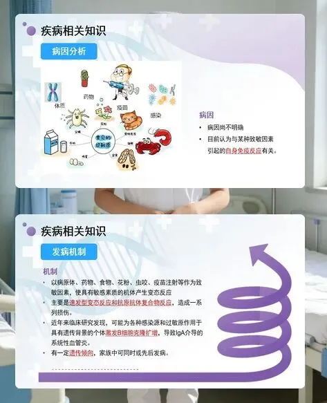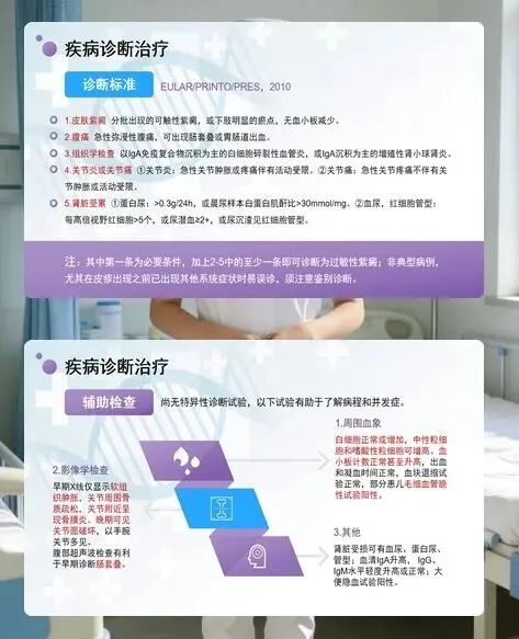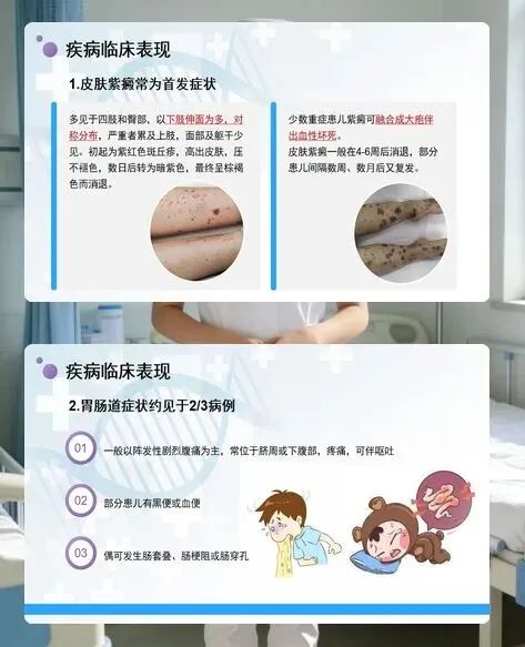 病情监测是重中之重。密切观察患儿的腹痛情况和大便性状,出现消化道出血时需限制饮食,必要时禁食并静脉补充营养;定时检查尿常规,及时发现血尿、蛋白尿等肾脏受累迹象,按肾炎护理规范干预。同时,要警惕肠套叠、肠梗阻等严重并发症,一旦发现异常立即报告医生。
