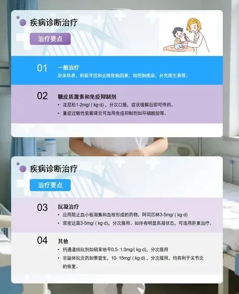临床护理需针对性突破核心难点。皮肤护理方面,要每日观察皮疹的形态、颜色和分布,保持皮肤清洁,给患儿穿宽松柔软的衣物,防止擦伤和抓伤,避免接触致敏原。疼痛管理上,协助关节肿痛的患儿采取舒适体位,可适当热敷缓解不适,按医嘱使用药物减轻关节疼痛和腹痛。
