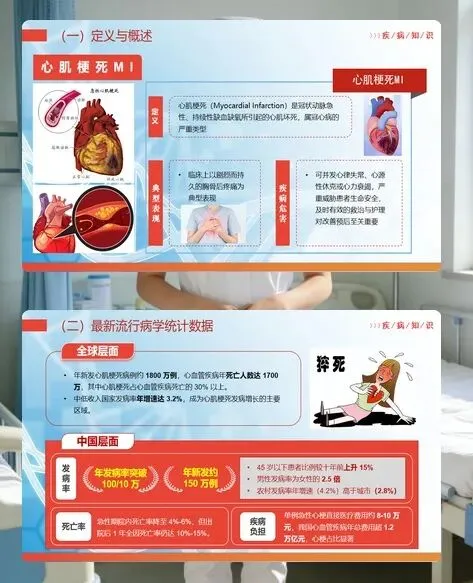 各位护理同仁,急性心肌梗死是冠状动脉急性缺血缺氧导致的心肌坏死,属于冠心病的严重类型,我国年新发病例约 150 万例,急性期院内死亡率达 4%-6%,及时有效的护理对改善患者预后至关重要。今天我们结合 69 岁急性前壁 STEMI 合并高血压患者的病例,梳理护理要点,积累实战经验。