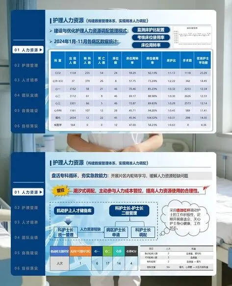 人力资源是工作开展的核心支撑。我们构建数据化管理体系,通过监测床护比、床位使用率等指标实现精准调配,建立机动护士储备库,采用潮汐式调配模式缓解人力短缺压力。全年完成跨科室支援、专科轮转等 10 余次,即便面临 18 人人员流动、9.2% 掉队率的挑战,仍通过科学统筹保障了各病区护理工作平稳有序推进。