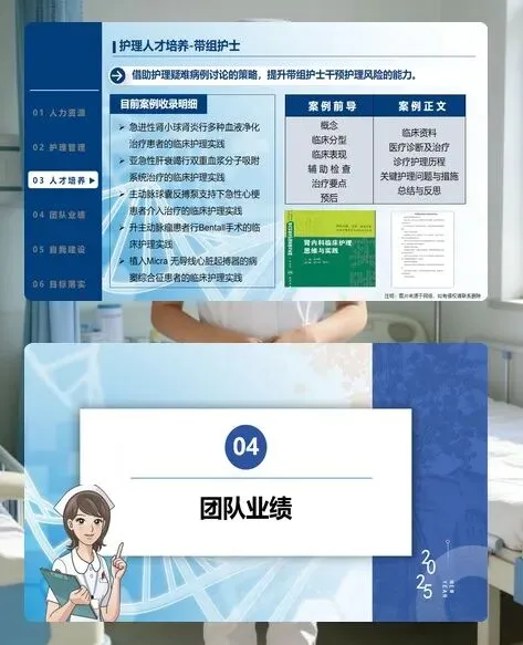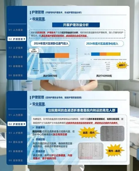 护理管理在规范与创新中持续提质。DRG 背景下,我们科学管控不可收费耗材,同时深挖专科护理效益,血液净化、俯卧位通气等专科技术创造了显著的社会与经济效益。安全管理上,优化血透患者转运交接流程,降低不良事件风险;科研领域成果丰硕,获批专利 2 项,开展 5 项护理新技术,课题申报与论文交流数量稳步提升。
