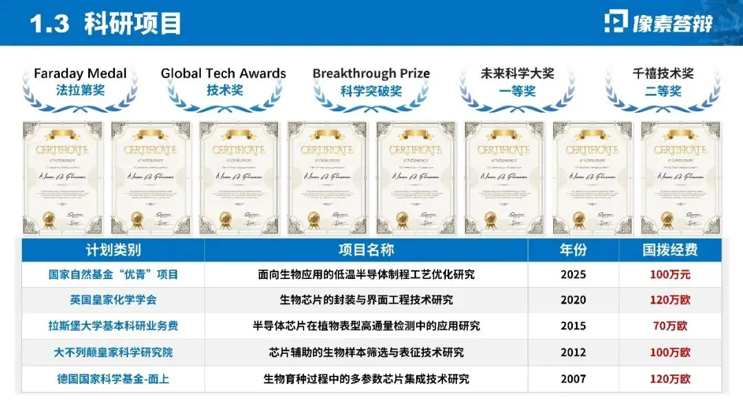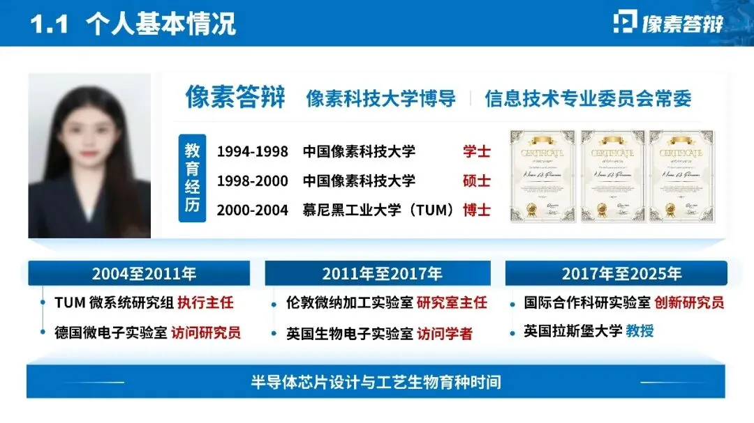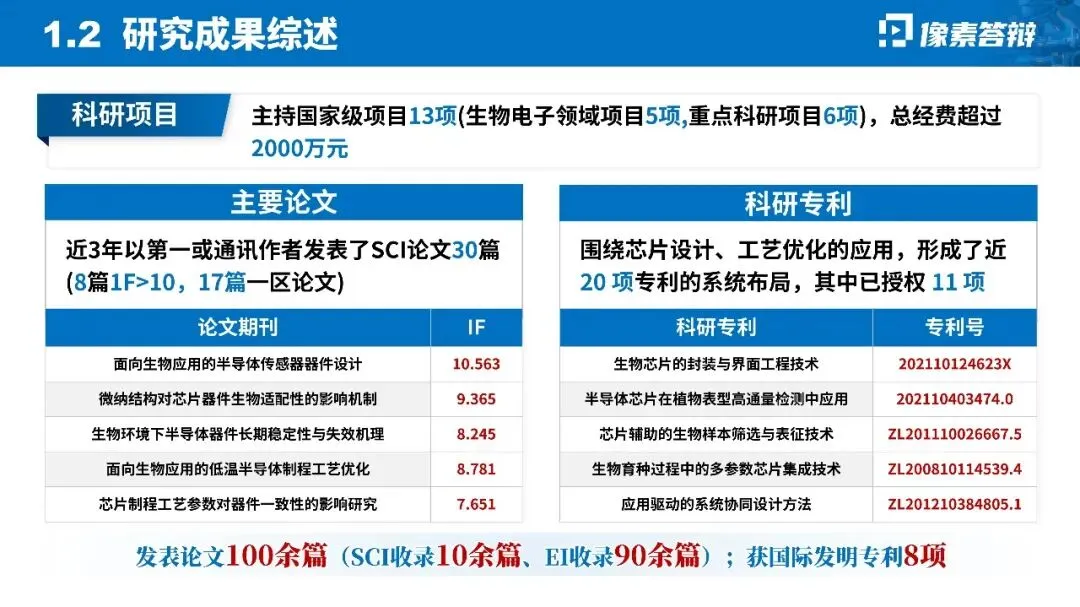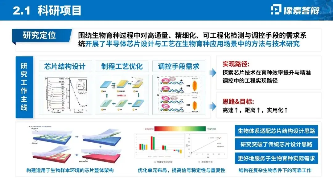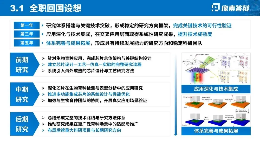 PPT框架清晰,涵盖个人背景、研究主线、回国规划与单位支撑四部分。个人部分突出学术资历与成果,但海外经历与国内合作的衔接可进一步强化。研究主线明确问题导向,从芯片架构、工艺窗口到应用反馈形成逻辑闭环,但生物育种场景的具体需求与技术指标可更具体化。回国规划分阶段推进,体系化强,但成果验证与团队协同路径需更细化。单位支撑展示平台资源充分,契合项目需求。