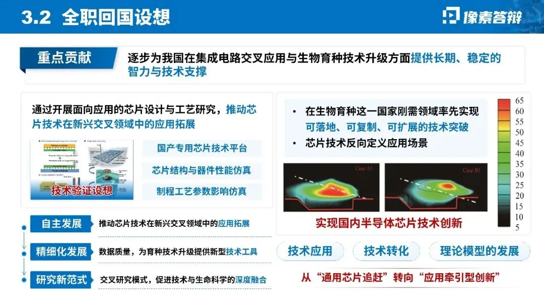 建议在答辩中强化以下方面:一是明确芯片在典型育种场景中的性能提升数据;二是突出反向设计方法相较于传统路径的创新性;三是细化回国后团队组建与跨学科合作机制。整体项目立意清晰、结构完整,若能在应用落地与技术细节上深化阐释,将更具竞争力。