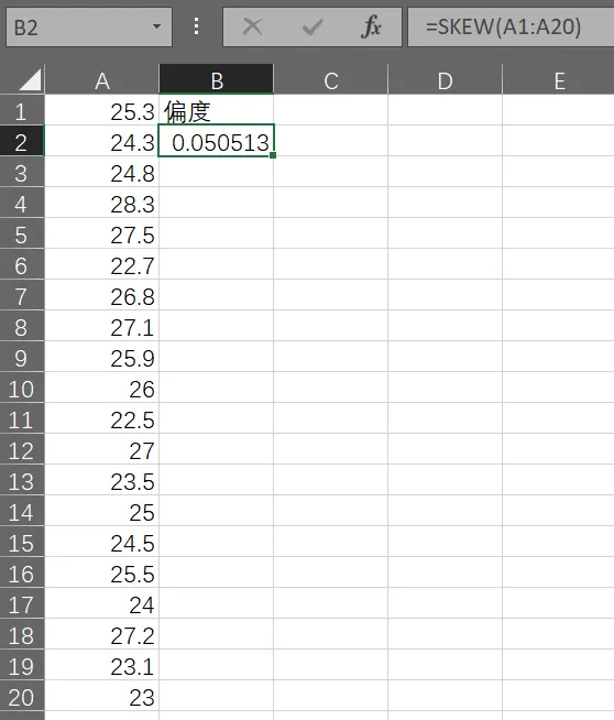 在Excel 2016中计算偏度,使用SKEW函数。
