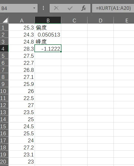在Excel2016中使用KURT函数计算峰度。