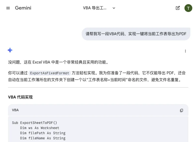 现在?直接问AI! 你只需要把需求喂给AI(如Gemini或元宝)说:“请帮我写一段VBA代码,实现一键将当前工作表导出为PDF。”