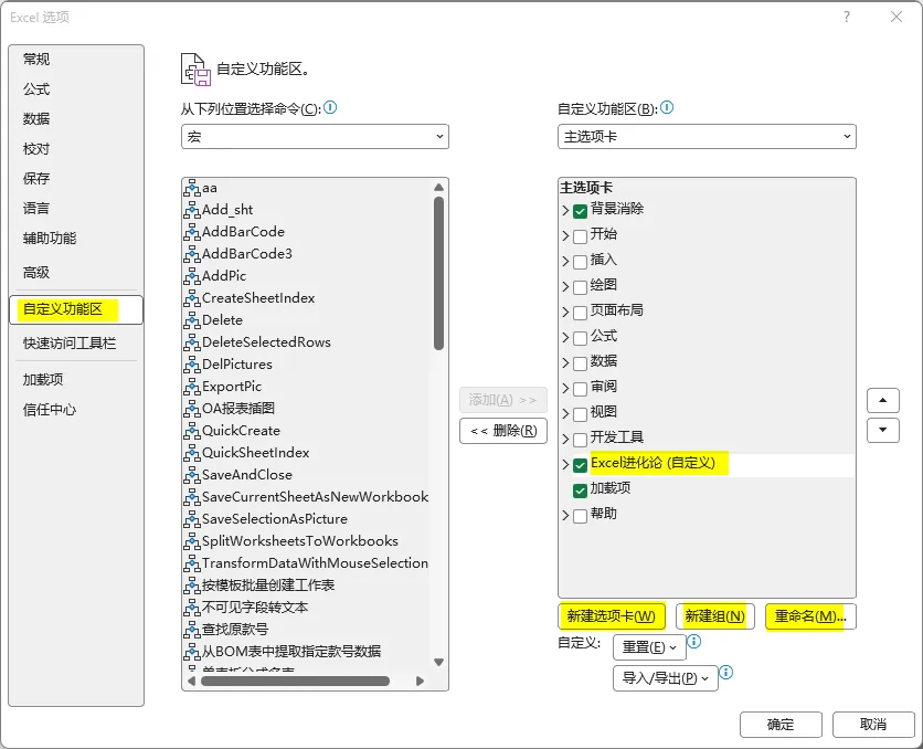 选中“新建选项卡(自定义)”,点击“重命名”,给它起个霸气的名字,比如“Excel 进化论”。