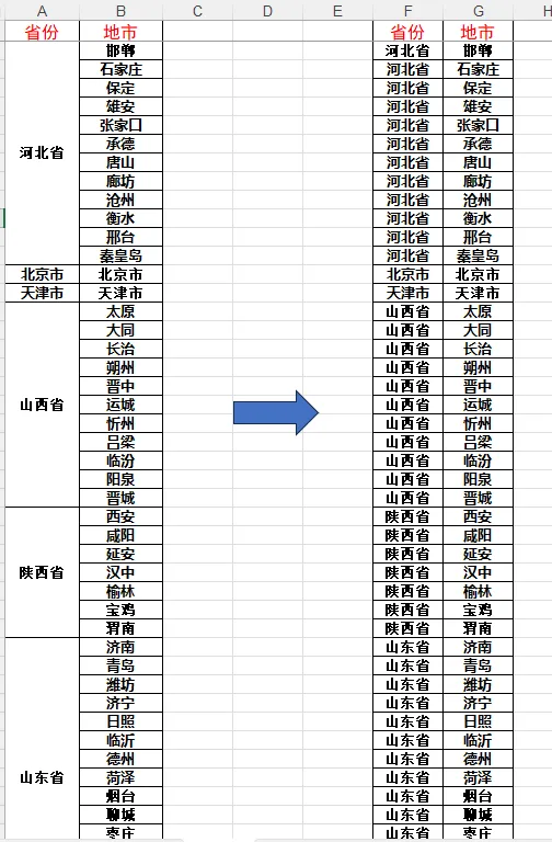 在工作中,我们使用Excel处理数据时,经常会碰到下面这样的不规则数据,A列和B列是一对一或一对多的关系,尤其是从数据库下载出来的数据这样的情况最多见。现在,我们需要把A列到B列区域的数据转换成F列到G列的数据,在行数不多的时候,只需要像下面这样,先将A列数据取消“合并后居中”,然后再手动将每个省双击填充就行,这样的情况只适用于数据量小、行数很少的时候。而工作中我们经常碰到的是几千、几万行这样的不规则数据,因此手动重复操作将耗费不少时间。下面我们就用3个步骤,5秒来解决这个问题:第二步:选中A列 → 按Ctrl+G → 点“定位条价” → 点“空值” → 确定。第三步:在定位到的单元格中输入“=A2”,然后按Ctrl+Enter,搞定。