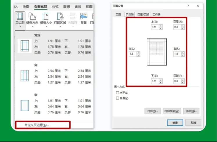 可在弹出列表中选择预设边距方案,或点选「自定义边距」进行手动设定。