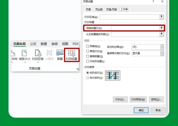 于「页面设置」窗口的「工作表」标签页,定位到「顶端标题行」设置项。