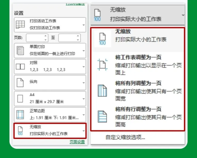 点击下拉框,选择「将工作表调整为一页」即可自动适配。