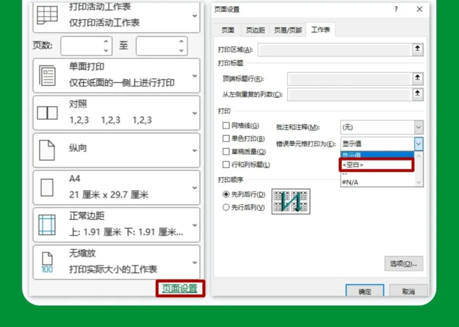 工作表中因公式计算、引用错误等出现的 #N/A、#VALUE! 等标识会影响打印页面的整洁度,可通过设置使其在打印时显示为空白。