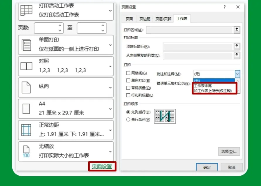 若单元格中添加的批注或注释含有重要说明信息,并希望在打印时一并呈现,可设置其打印位置与方式。