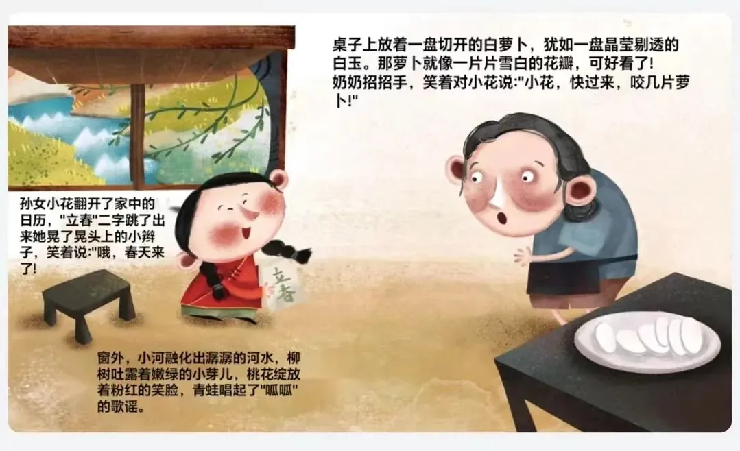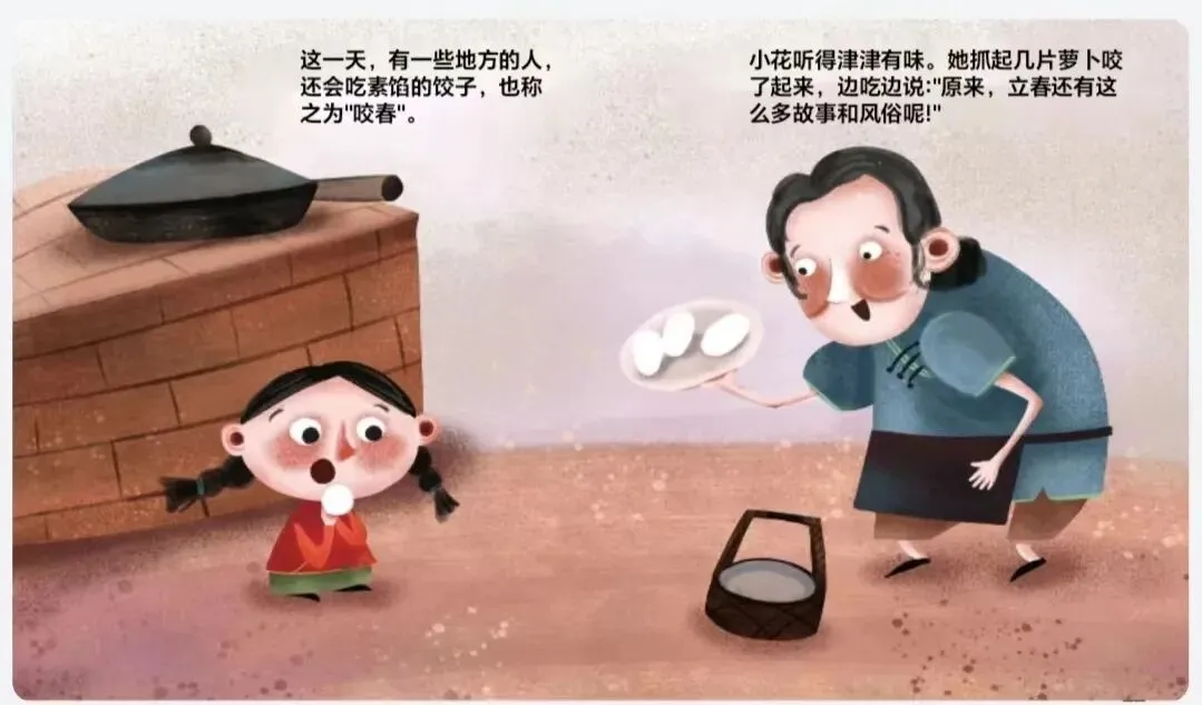 小花听得津津有味。她抓起几片萝卜咬了起来,边吃边说:“原来,立春还有这么多故事和风俗呢!”